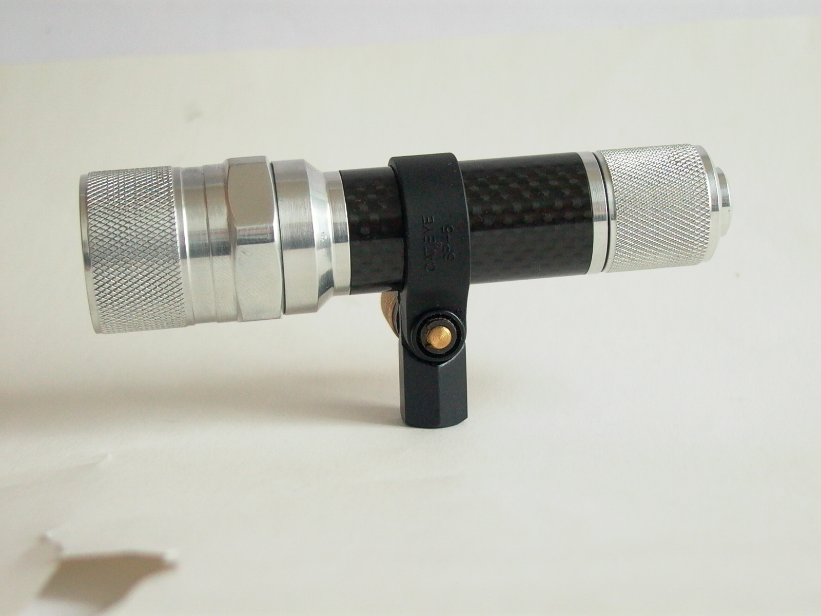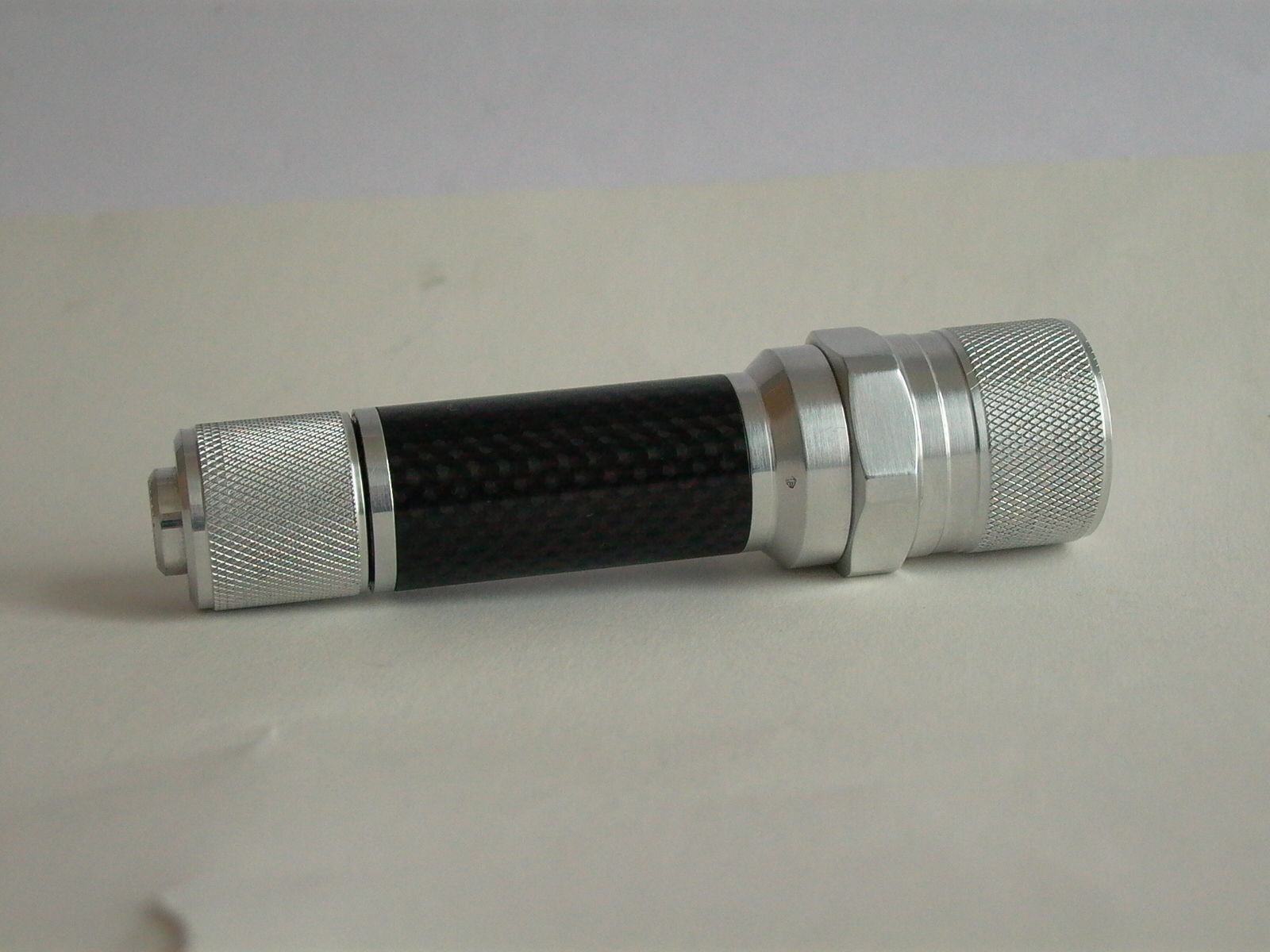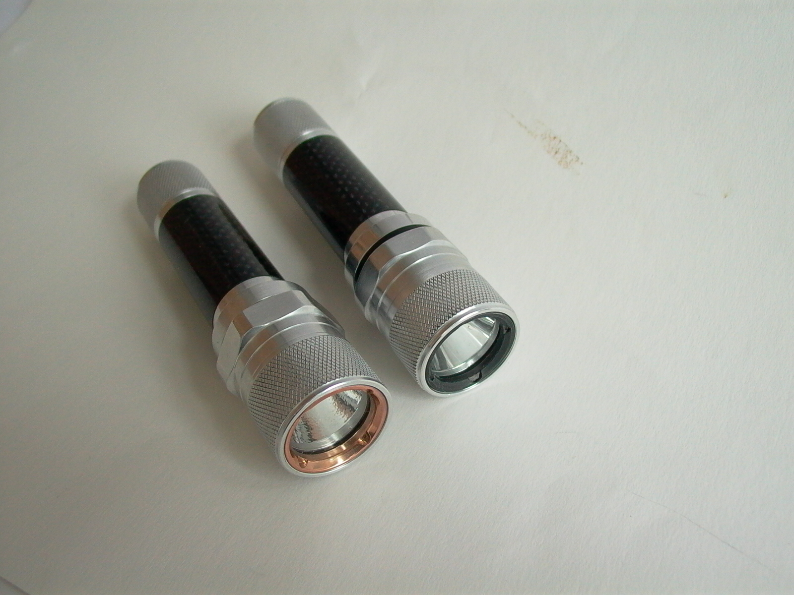Neuen Lampen mit echter Carbonhülse oder auch mit Wüsteneisenholz die hülsen sind mit wenigen handgriffe tauschbar Die DistanzRinge sind Messing vergoldet Flugzeugaluminium nach Din.... Glas Borasilikat Kanten Rotieniert Dichtringe Viton Wasserdicht bis 10m Hart Eloxiert ca' 600/900Lumen Die Brenner sind tauschbar auf IR.860nm> mit Akku 3,7Volt und Ladegerät Betrieb mit 2 Akku oder mit einem Akku oder 1 Batterie oder 2 Batterien Dazu mit ein Dummi